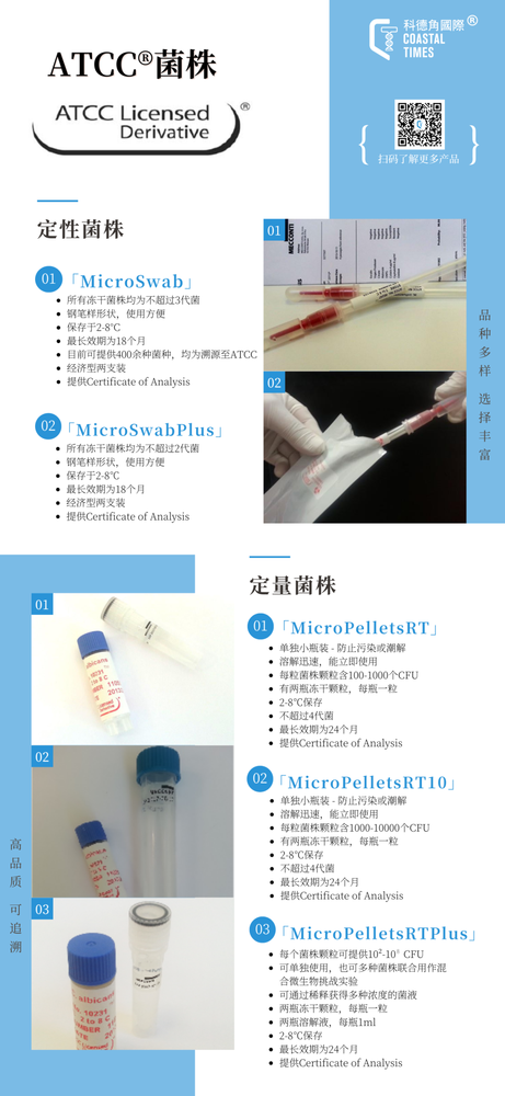 科德角国际的ATCC菌株产品线涵盖600多种标准菌株,每一株均严格遵循ATCC授权衍生物计划生产,达到ISO双重质量标准。
