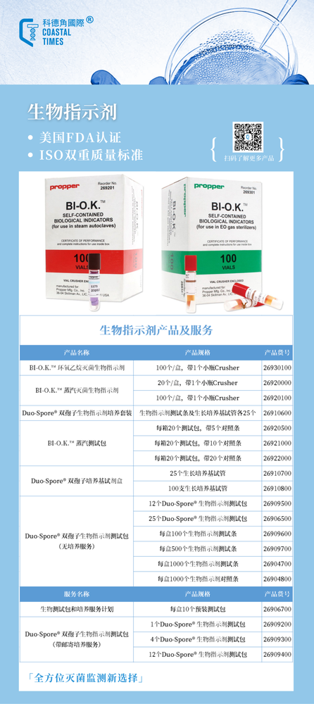 在灭菌效果监测领域,科德角国际的美国Propper生物指示剂荣获美国FDA认证并遵循ISO双重质量标准,全面覆盖从饱和蒸汽到环氧乙烷、干热乃至气化过氧化氢(VHP)等多种灭菌方式。